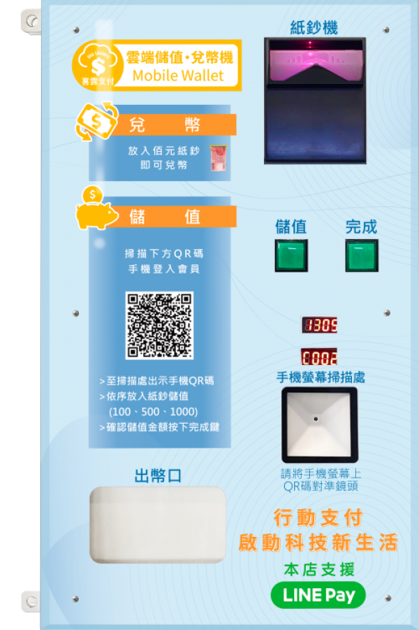 ■ 儲值:可收NT$100、200、500、1000元紙;鈔現場儲值手機即刻知。